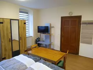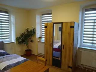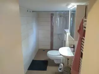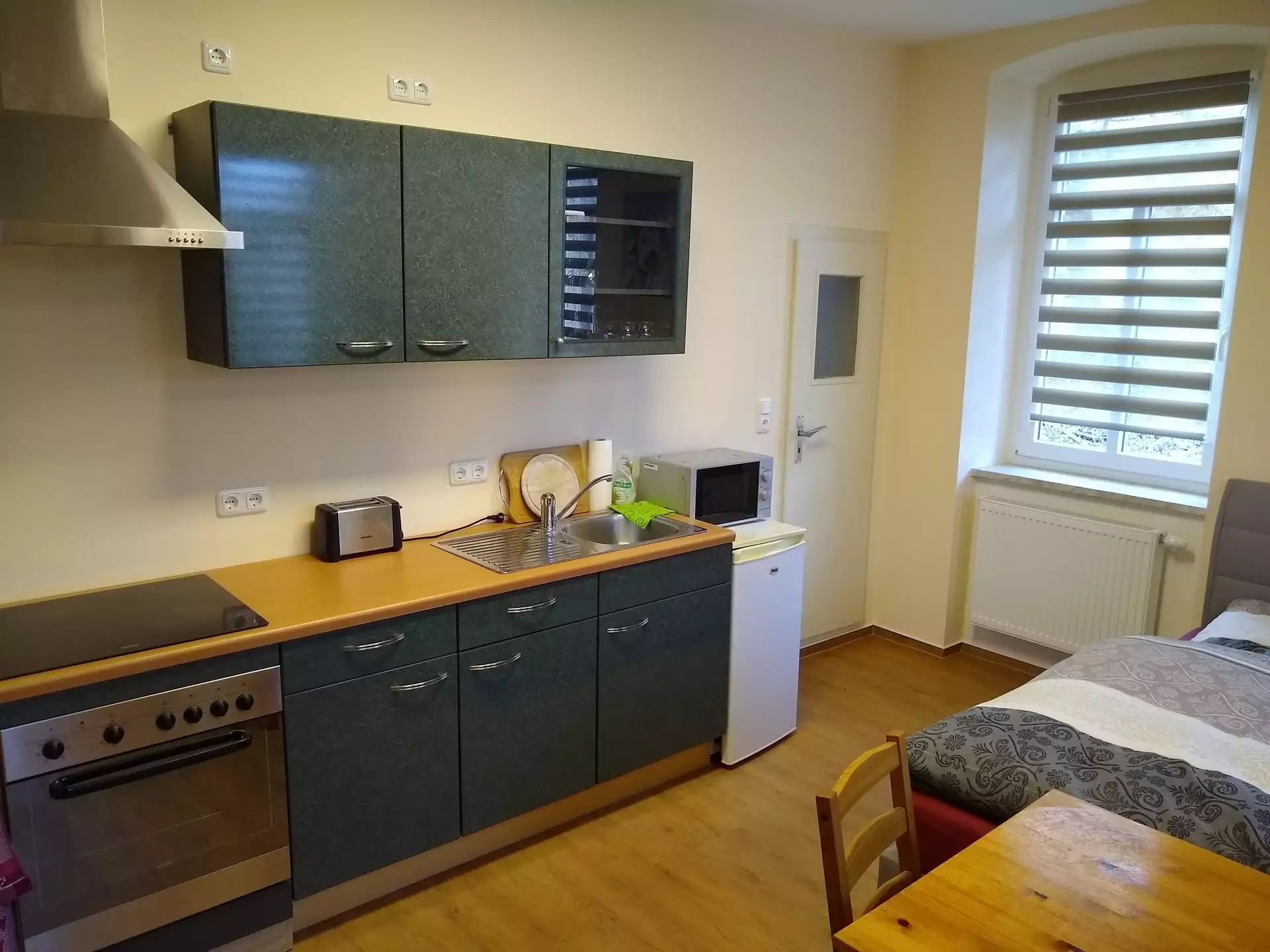 Unsere FeWo1 verfügt über TV, eine Küche mit Mirkowelle, Toster, Wasserkocher, Herd mit Backofen, Kühlschrank, ein Doppelbett sowie ein eigenes kleines Bad/WC. Handtücher und Fön sind selbstverständlich vorhanden.